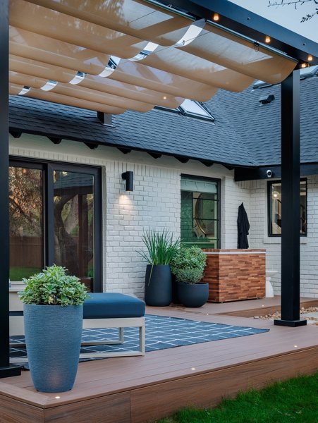 One of the most striking architectural elements in this outdoor retreat is the Trex Spiral Staircase, which connects the upper and lower decks while adding a bold design statement. “My design was inspired by the desire to maximize space, connect the upper deck with the lower deck, and add a visually striking element to the outdoor areas,” says Moore. “It’s not only space-efficient but also creates a dynamic architectural feature that draws the eye and enhances the overall aesthetic of the space.”